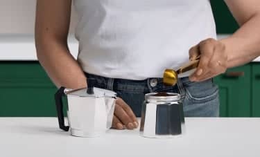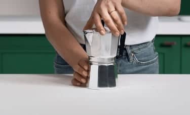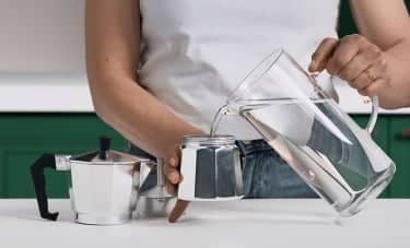 برای شروع، آب جوش را داخل قسمت پایینی موکاپات بریزید و اجازه دهید حدود ۳۰ ثانیه خنک شود. آب را تا جایی بریزید که سطح آن درست زیر سوپاپ اطمینان قرار بگیرد.